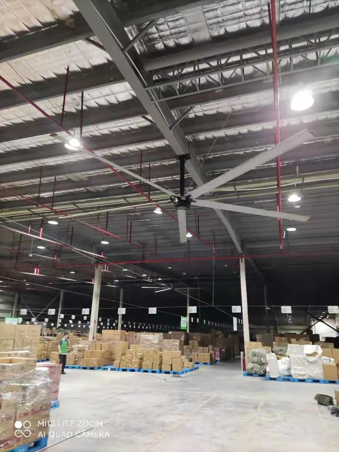 安装在仓库内使用,通过规划布局,一部分工业吊扇安装在物品存放区,一部分安装的员工装卸、搬运区,通过工业大型吊扇的通风功能,可以同时解决仓库除湿与员工降温问题,一举两得。